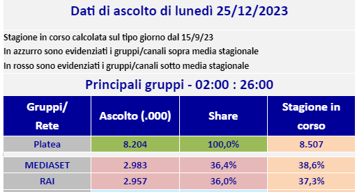 Comunque, giurin giorello, non potevamo immaginare un fine anno ancor più bello. La “contesa” sugli ascolti tra RAI e Mediaset sta raggiungendo vette sublimi, delizia per gli occhi che leggono i dati, meglio del panettone con i canditi inzuppati nel caffellatte!!! Leggere i giornali stamattina è puro godimento: da una parte i complottisti che tramano sempre contro Viale Mazzini a priori, sempre e comunque. Dall’altro lato gli innocentisti fino a prova contraria, comunque va bene, del tipo “noi siamo buoni a prescindere”. Leggiamo: Il Tempo “Un anno da record per le tre reti Rai leader negli ascolti”, La Stampa “Mediaset annuncia il sorpasso sulla Rai "Risultato storico senza precedenti. Ma sui dati di ascolto è guerra di cifre”, Prima On Line “Rai: un anno di record per il Servizio Pubblico” e Italia Oggi “Mediaset, nel 2023 prima per ascolti La Rai resta in testa con le generaliste”.